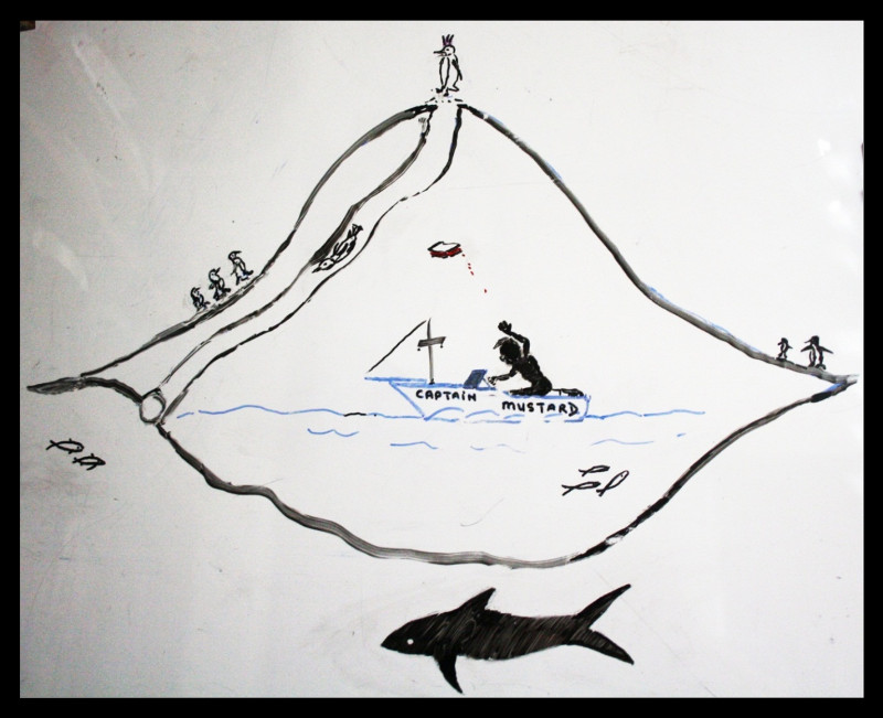 King Penguin saw Captain Mustard sailing by the Iceberg.