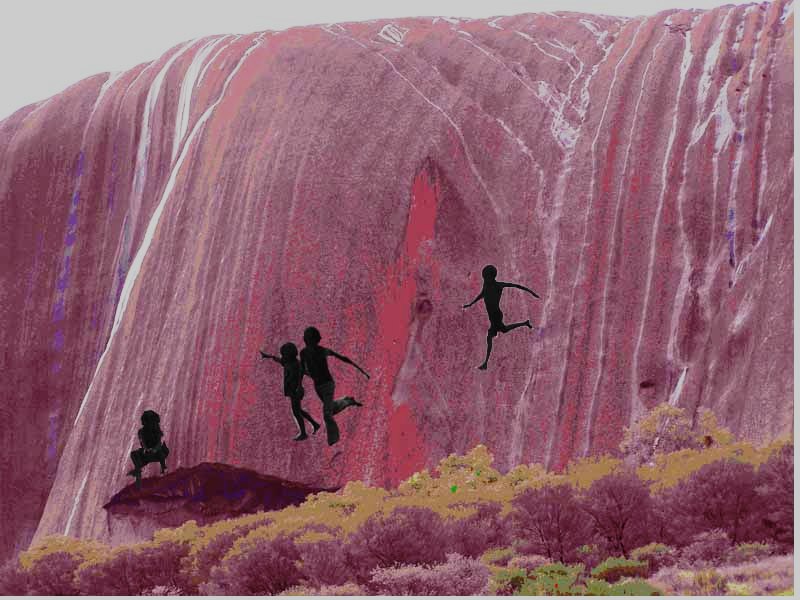 Indigenous children taking steps and Playing in the rain. Raining on the Rock (Uluru).